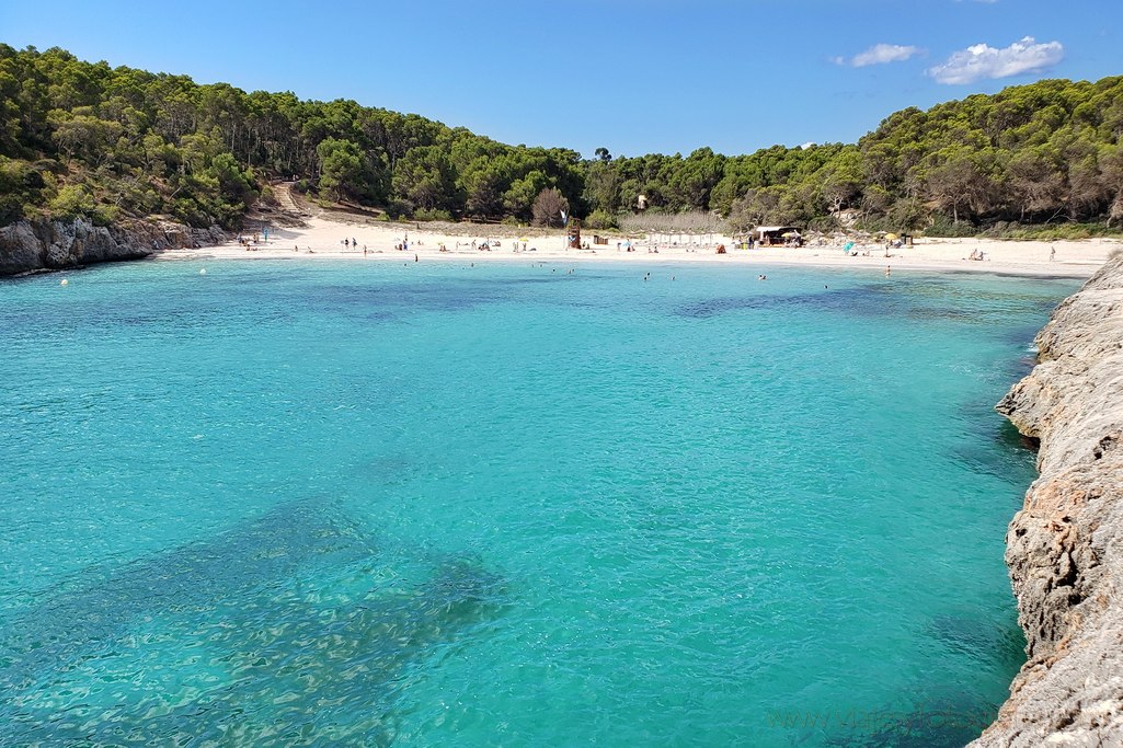 Estas 3 calas se encuentran muy cercanas en una zona llamada Cala Mendía ubicada a unos 6 km. al sur del puerto de Manacor. Empiezo por Cala Romántica, vaya nombrecito ¿verdad? En realidad, esta cala está ubicada en el llamado Estany d´en Mas. Y es perfecta para aquellos que no se quieren complicar la vida: fácil aparcamiento, restaurantes con terrazas y estupendas vistas, paseos por los acantilados al borde del mar… Y una gran playa de arena blanca donde poder instalarte a gusto sin apreturas. No es la más bonita, pero sí una de las más prácticas y cómodas si quieres pasar un día completo de playa.