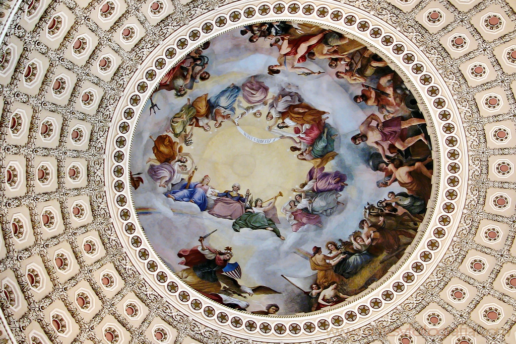 Está claro que estamos en Estados Unidos porque algo así en España no existe y es impensable debido al sentimiento de vergüenza histórica que nos han inculcado. Por supuesto también se representan fragmentos de la historia norteamericana, desde la llegada de los peregrinos en el Mayflower, la historia de Pocahontas, la batalla de Lexington, la proclamación de la Independencia o la guerra Hispano-Norteamericana de 1898. En lo más alto de la cúpula se representa «La Apoteosis» una alegoría simbólica en la que G. Washington asciende a los cielos flanqueado por la Libertad y la Victoria. Así que mirad bien y con atención a los detalles. Haréis un viaje de 500 años por la Historia de América en una sola rotonda.