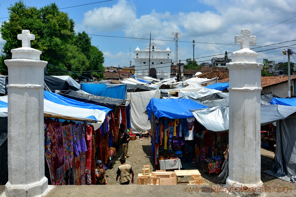 Frente a la iglesia ya no hay quien camine. Tomando el pasadizo de enfrente entre más y más tenderetes me dirijo hacia la Capilla del Calvario que a estas horas de la mañana parece un lugar más tranquilo. Me dicen que aquí no pueden entrar los curas católicos y tras subir las escaleras veo que hay un pequeño altar con ofrendas en la entrada. El exterior de la iglesia es de un blanco inmaculado, pero su interior es pequeño y oscuro. Apenas está iluminado por las velas que se consumen en los altares rectangulares de piedra que ocupan la pequeña nave central. Al fondo a la derecha hay una pequeña capilla todavía más oscura. De su interior oigo que salen rezos y oraciones murmuradas en quiché y veo a varias personas arrodilladas entre la penumbra y decido no entrar. Desde el exterior las callejuelas de Chichicastenango aparecen cubiertas de los techos de plástico del mercado entre los que sólo sobresale la iglesia de Santo Tomás.
