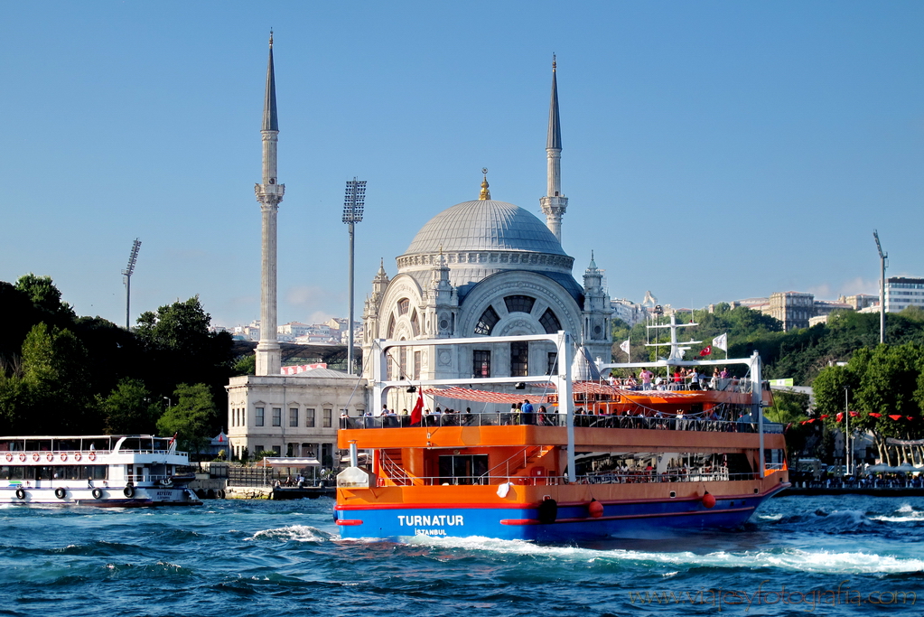 La parada principal se encuentra junto a Santa Sofía y tras pagar el billete me subo a la parte de arriba y al aire libre para dejarme llevar por la ciudad. Rodeado de turistas y como uno más de ellos, me refugio en el asiento de plástico y me abandono al caos del tráfico mañanero. El autobús recorre lentamente el Puente Gálata hasta el barrio de Kabatas y para frente a las puertas del Palacio Dolmabahçe, que no pienso visitar. No tengo gran interés en pasarme la mañana recorriendo las 248 habitaciones y 43 salones de este palacio construido en un estilo totalmente occidental a mediados del XIX en plena decadencia del Imperio Otomano. Hoy, además de servir como museo y lugar de recepción de personalidades, se ha convertido en el lugar favorito de las parejas de Estambul para casarse. De paso se toman las fotos de rigor a orillas del Bósforo, junto a la elegante Torre del Reloj y la hermosa Mezquita de Bezmi Alem Valide Sultan Camii o Dolmabahce Camii.