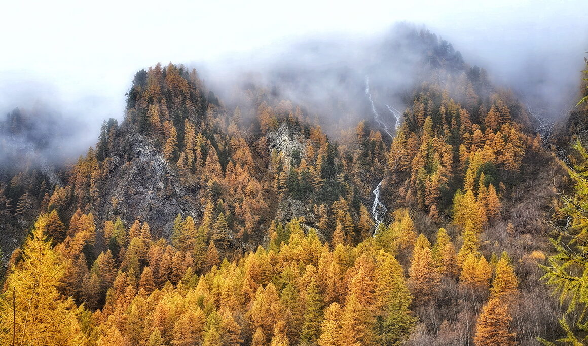 Aquí los pueblos de piedra y madera parecen detenidos en el tiempo, las carreteras serpentean hasta perderse en collados panorámicos, y los bosques de alerces (sí, esos pinos caducifolios que en otoño se tiñen de amarillo dorado) dominan el paisaje.