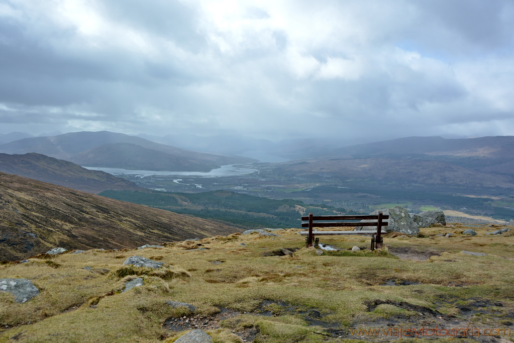 En cuanto llegué arriba un viento huracanado se sumó al frío gélido que bajaba de las cumbres nevadas del Ben Nevis. Fue una caminata intensa en la que disfruté, congelado y zarandeado por el viento, del paisaje escocés desde el lugar más elevado del Reino Unido. Desde estas alturas el paisaje escocés se extiende magnífico allá abajo. Fort William y el lago Eil se encontraban a mi izquierda. El lago Lochy, una de cuyas orillas había recorrido el día anterior, se extendía hacia el norte. A mi alrededor el suelo de turba estaba cubierto por hierbas de color ocre y de riachuelos que bajan de la cumbre. El aire era frío, húmedo y puro. Cuando encontré uno de esos bancos con «las mejores vistas del mundo» pensé que este es un lugar realmente hermoso para perderse.