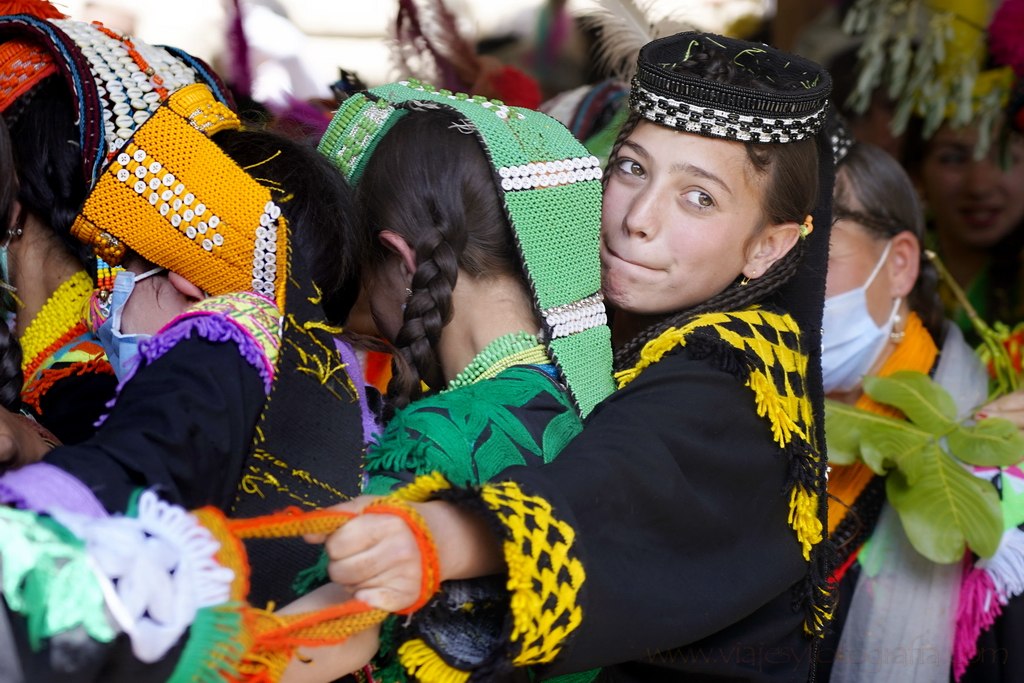 Son días en los que las mujeres, vestidas con sus trajes típicos, bailan y giran abrazadas por la cintura en un hipnótico baile. Ellos visten el tradicional Shalwar Kameez mientras los hombres solteros se identifican llevando unas fajas bordas a mano llamadas paati. Finalmente, hombres y mujeres animados por el vino y el aguardiente, bailan y cantan juntos en círculo al ritmo de los tambores. Sí, vino y aguardiente, porque los kalash han mantenido el cultivo de la vid como parte de su cultura, al igual que los ismaelitas del valle de Hunza.