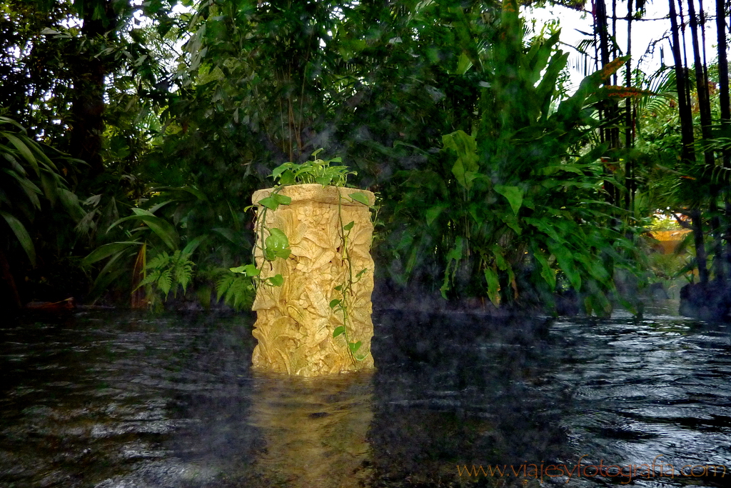 La exuberancia de los jardines selváticos plagados de flores y plantas desconocidas es tal que uno no sabe por dónde empezar. Hay varios senderos que conducen a diferentes zonas acotadas de cascadas y piscinas naturales con tumbonas donde solazarse en el paraíso visual del entorno que nos rodea. Sin duda es un lugar de una belleza impactante que a veces parece esfumarse entre la niebla producida por los vapores de agua.