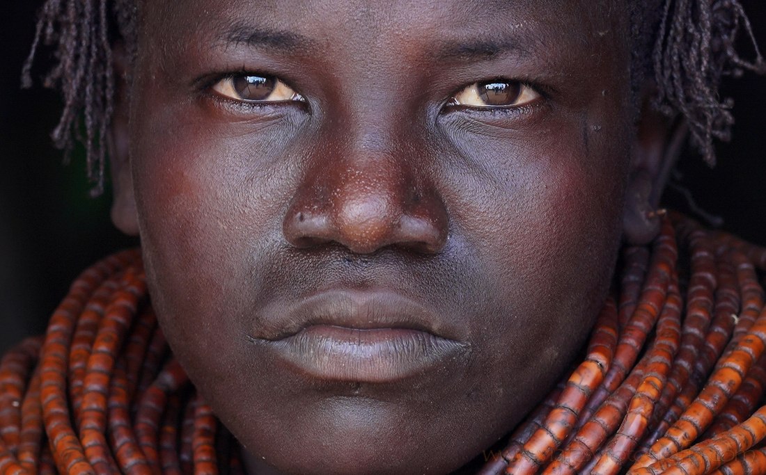 Las mujeres nyangatom portan sus collares en una cantidad asombrosa. Los collares tradicionales se elaboran con unas semillas secas de color ocre. Pero están siendo sustituidos por los de cuentas de colores muy habituales en el norte de Kenia. Tanto es así que sólo puede fotografiar a esta joven ataviada con sus collares tradicionales.